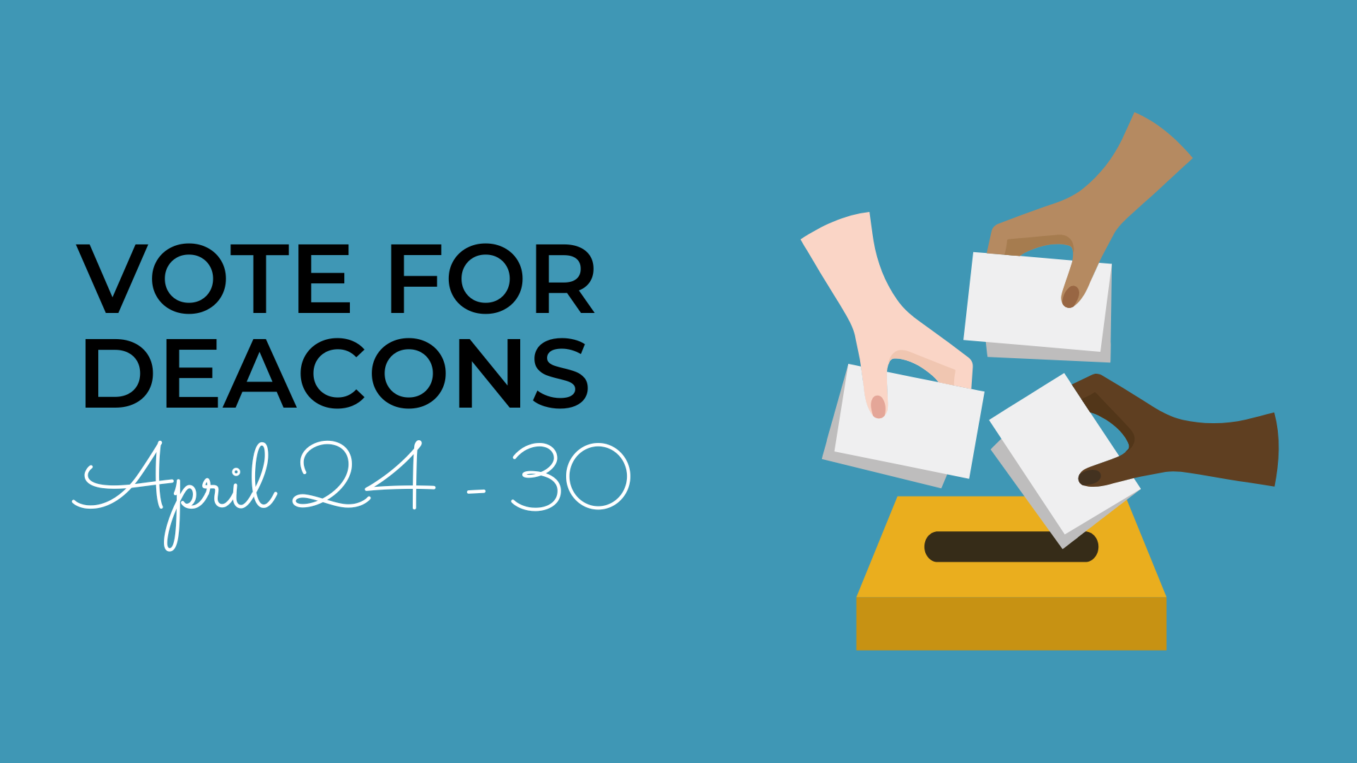 Voting begins today for four men to serve as deacons for a three-year term. You may click on the link below to cast your vote now or you may vote in person during the service Wednesday night. Voting concludes at 7PM on April 30.
