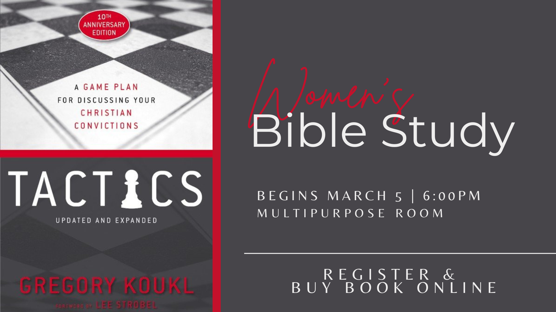 Tactics start date was delayed. We will begin THIS Wednesday night in the Multipurpose Room. This class will change the way you share the gospel! We hope you will join us.